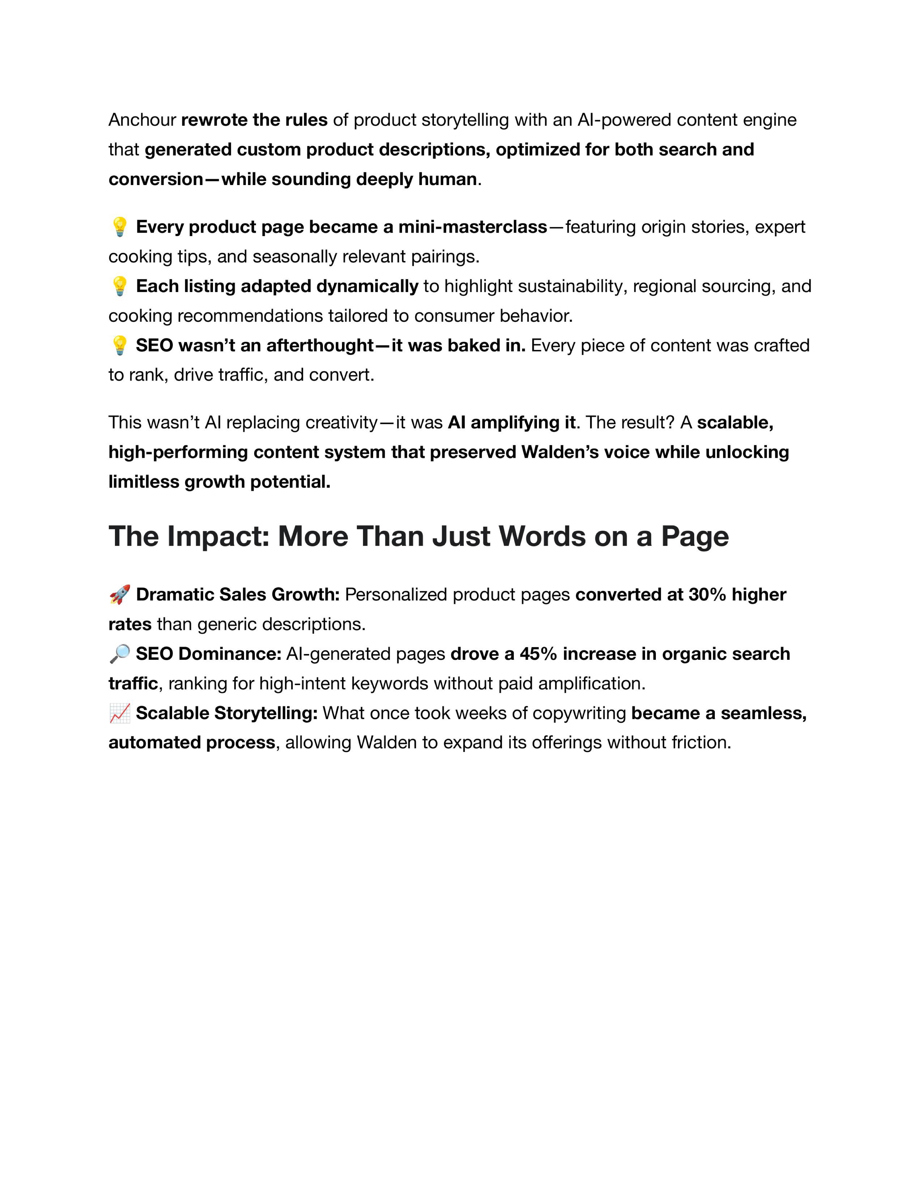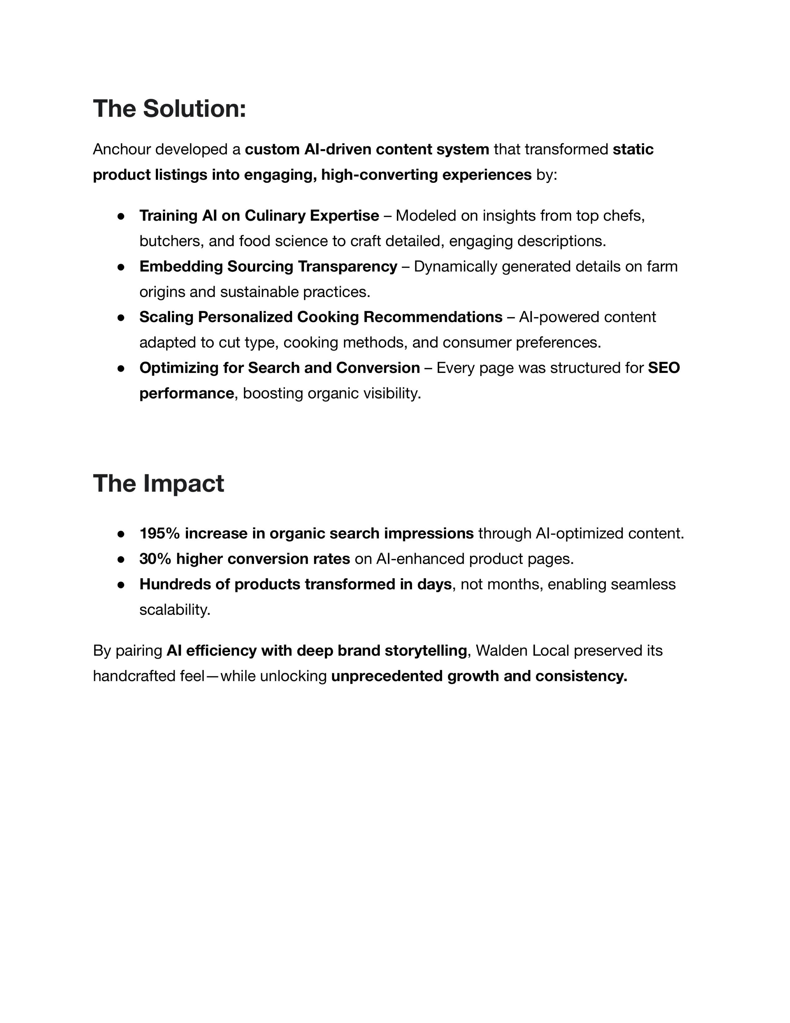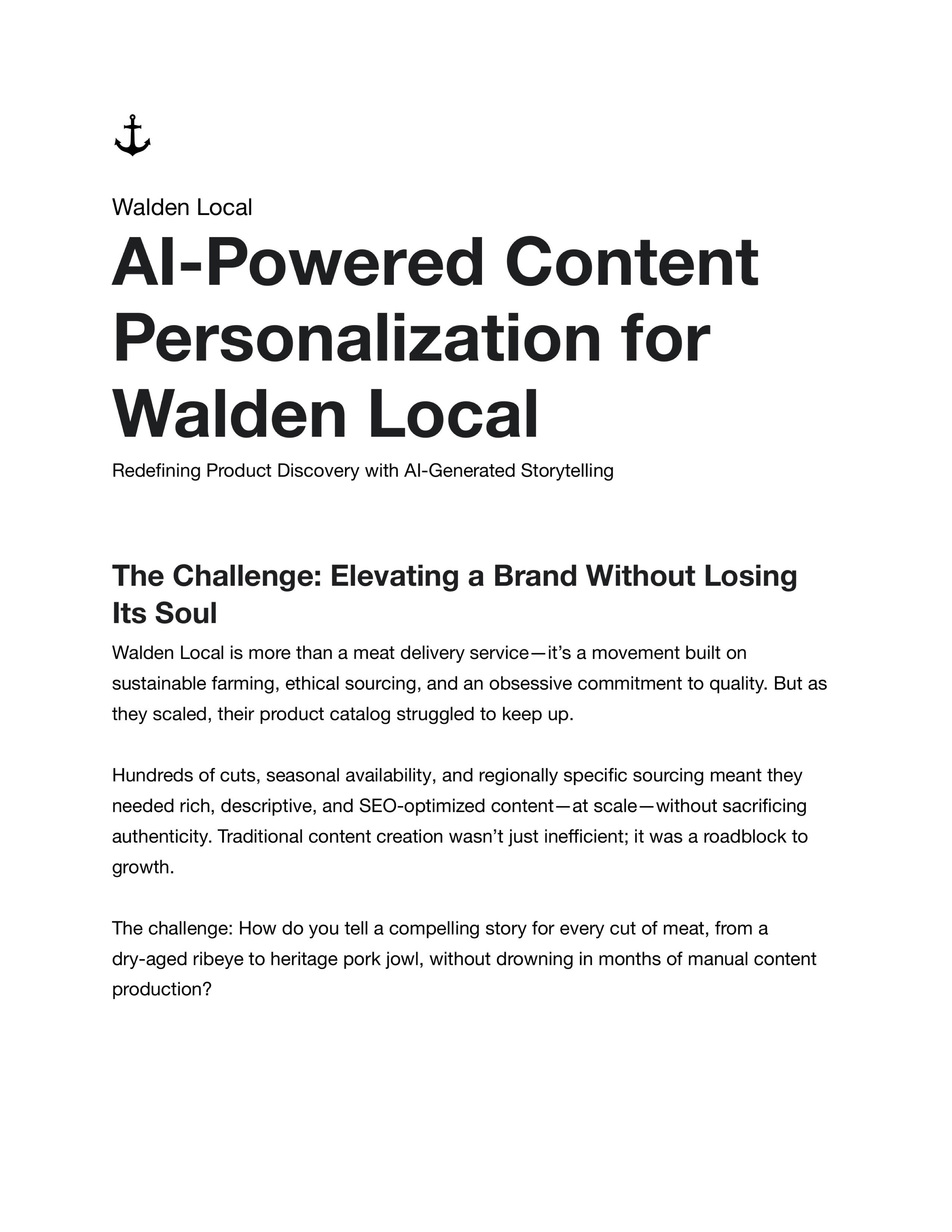 Walden Local, a sustainable meat delivery service, faced a challenge: how to scale product storytelling without losing its handcrafted feel. With hundreds of cuts, seasonal availability, and regionally specific sourcing, traditional content creation was inefficient and limiting growth. Anchour developed an AI-driven content system that transformed static product listings into engaging, high-converting experiences. By training AI on culinary expertise, embedding sourcing transparency, and scaling personalized cooking recommendations, Walden Local maintained authenticity while optimizing for search and conversion. The impact was remarkable: a 195% increase in organic search impressions, 30% higher conversion rates, and hundreds of products transformed in days, not months. AI didn't replace creativity—it amplified it, allowing Walden Local to scale seamlessly while preserving its voice. This innovative approach redefined product discovery, proving that AI can craft compelling, human-like storytelling that drives real business results.