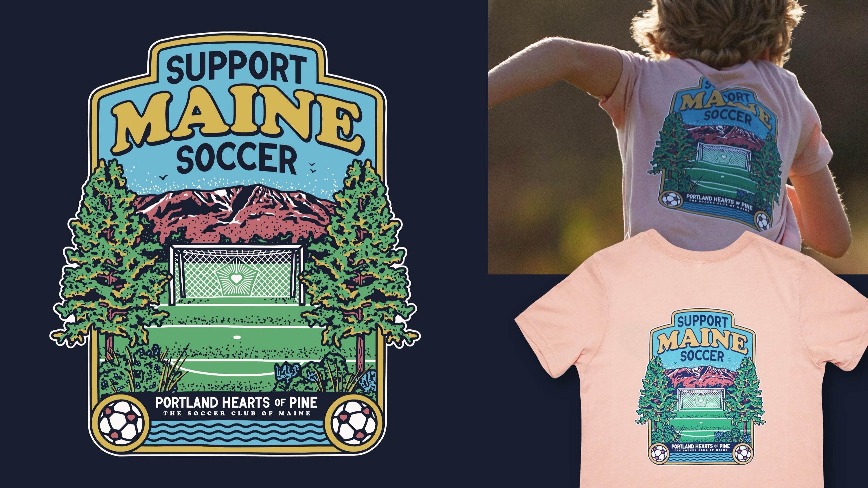 The Portland Hearts of Pine begin their inaugural season in May, and despite not yet playing a game, have introduced themselves as a community-driven soccer club for all of Maine to support. I was tasked with designing multiple items for the team's first merch drop, targeting the entire state's soccer community, from the kids playing the game, to parents and coaches across Maine. The Hearts' aim is to have their branded merchandise feel like a lifestyle brand that soccer fans and non-soccer fans alike can enjoy and wear with pride for the state of Maine. My illustrations include a 'Support Maine Soccer' badge that was used on t-shirts, stickers and magnets, a map of the state of Maine announcing the Hearts as 'The Soccer Club of Maine' and showcasing all the places, animals, and objects that make up this state, and a take on Maine's iconic Moxie soda label.