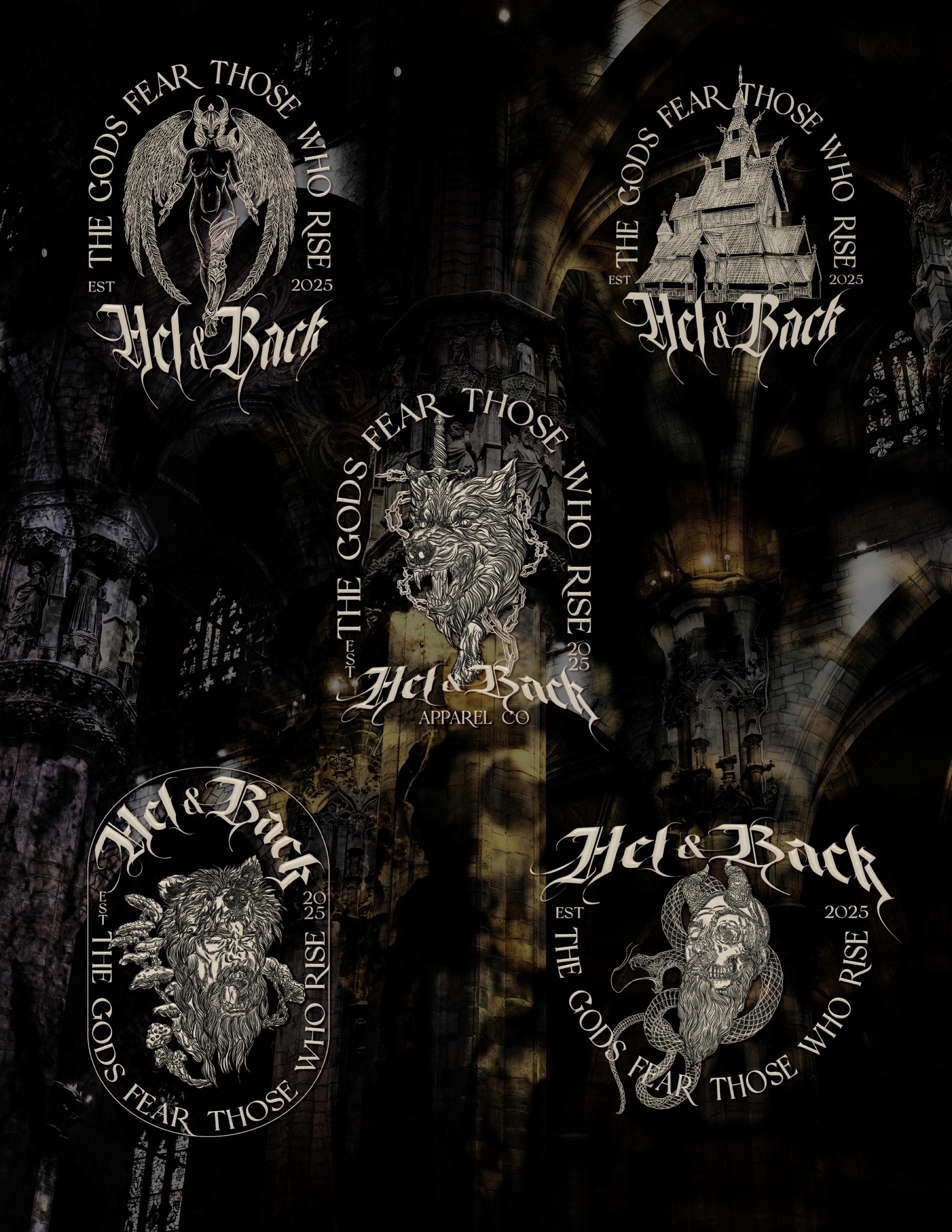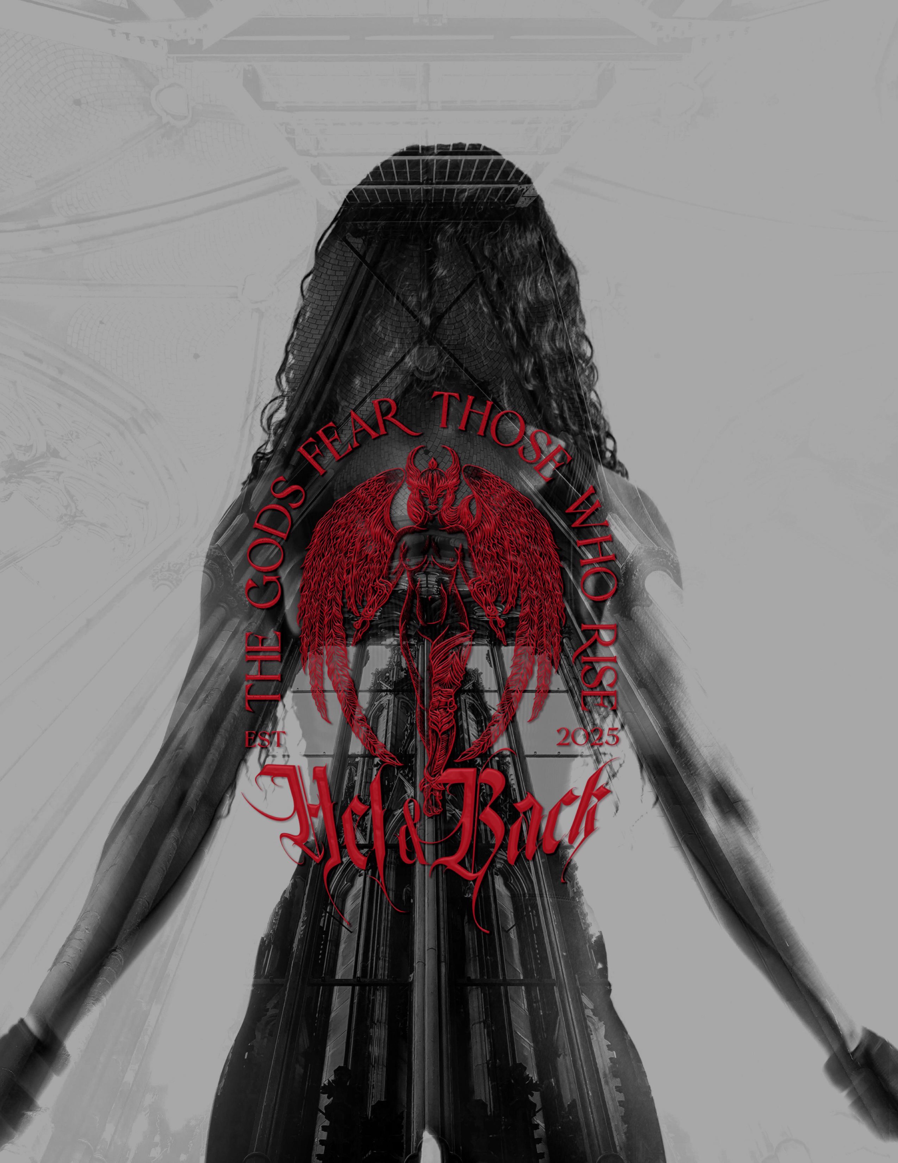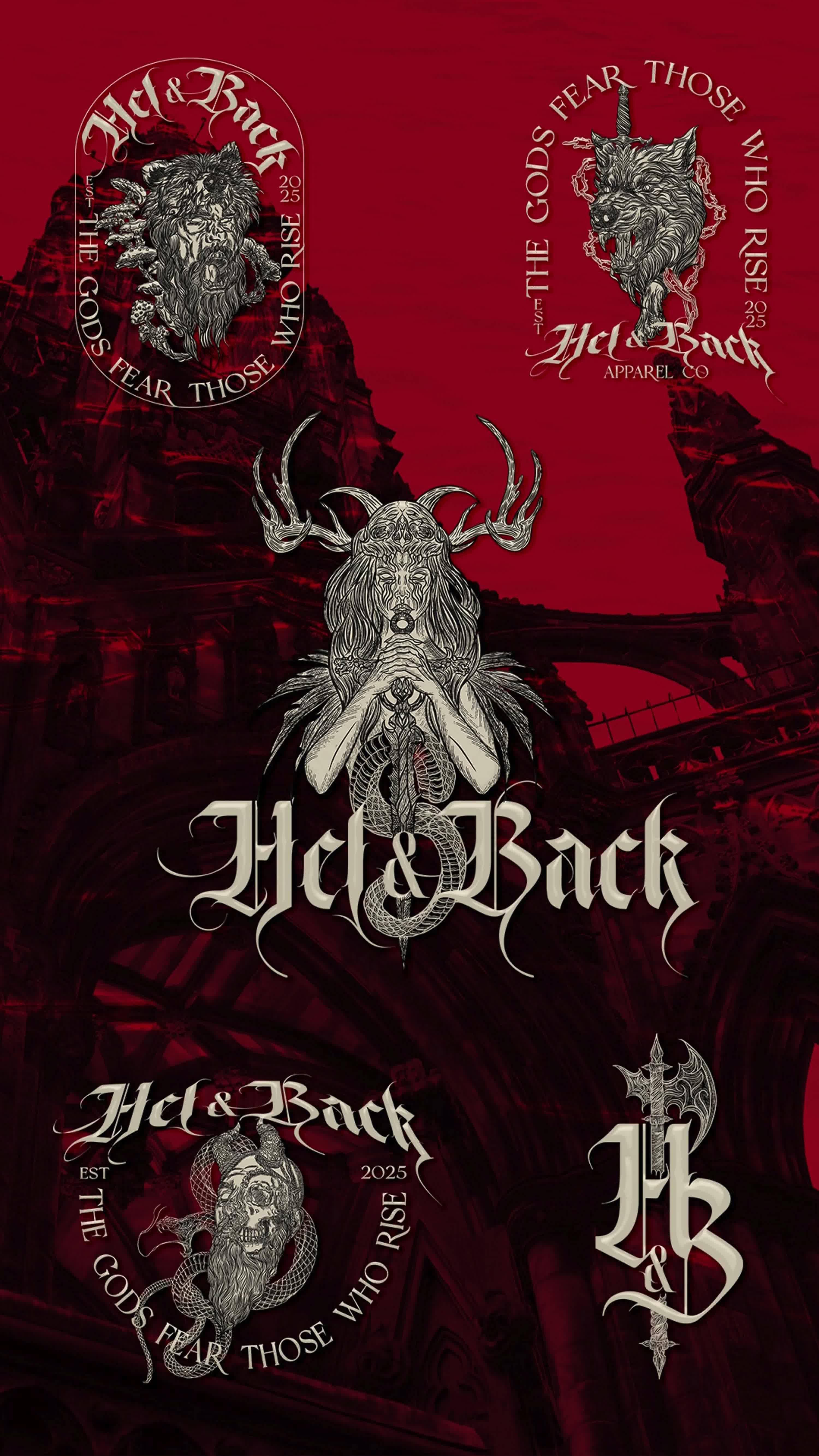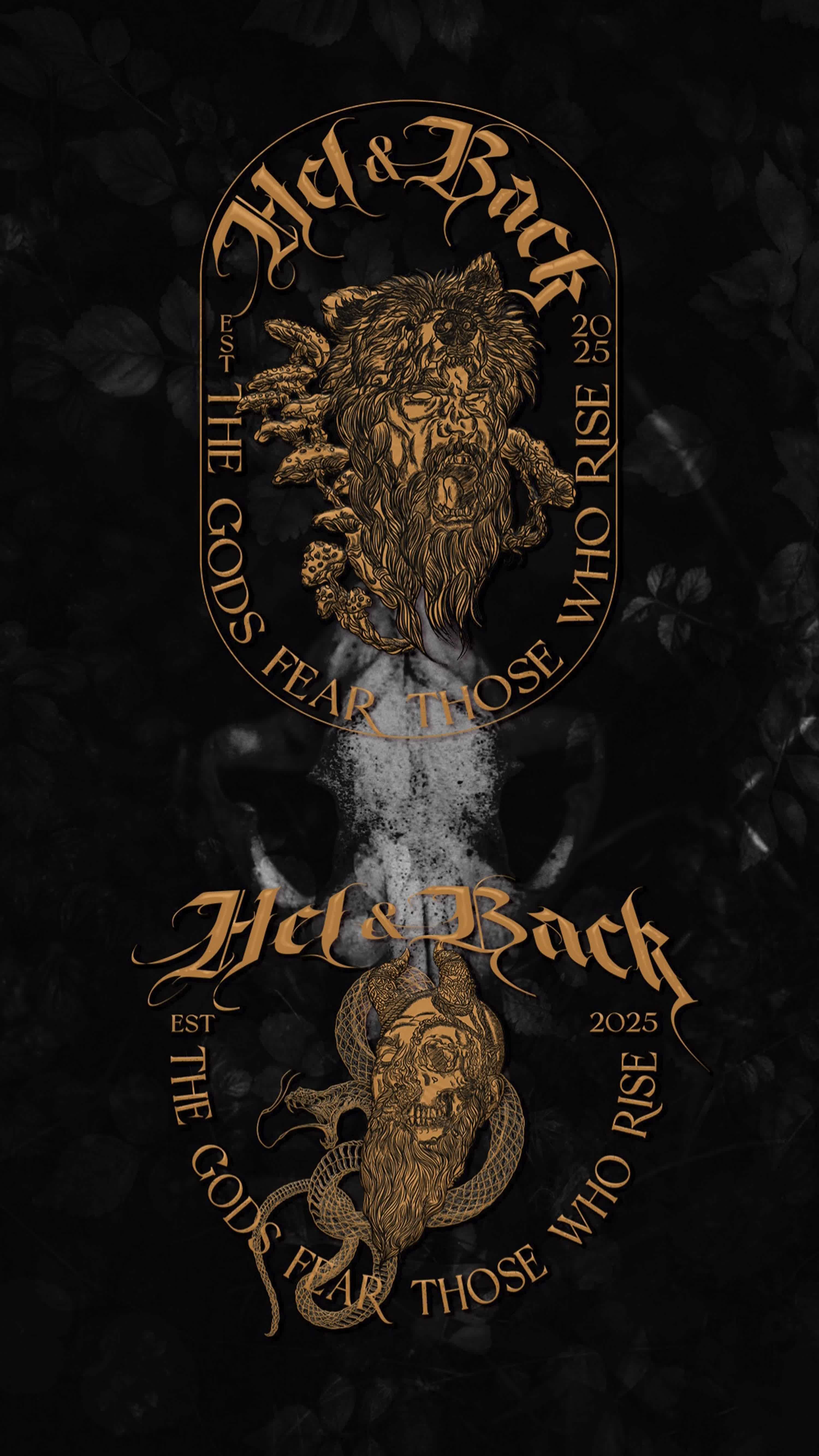 The Hel & Back visual identity draws deeply from Norse mythology, channeling strength, sacrifice, and transformation through a dark, modern lens. Typography is foundational—anchored in bold serif and gothic-inspired fonts that echo ancient runes, commanding attention while maintaining an air of mysticism and heritage. The color palette is minimal and intentional: dominant tones of charcoal, ash, and pure black reflect the brand's underworld inspiration, while bone white and blood red serve as accents—symbolizing life, death, and endurance. These tones support a raw, primal aesthetic across all platforms. The imagery is atmospheric and emotionally charged, favoring high contrast, desaturated palettes, and dramatic shadowplay. Visuals often highlight isolation, ritual, and physical power, creating a mythic, immersive tone. Textures such as stone, steel, smoke, and worn fabric reinforce a tactile, lived-in feel. Together, these elements create a cohesive visual language that embodies the Hel & Back ethos: forged in darkness, built to endure.