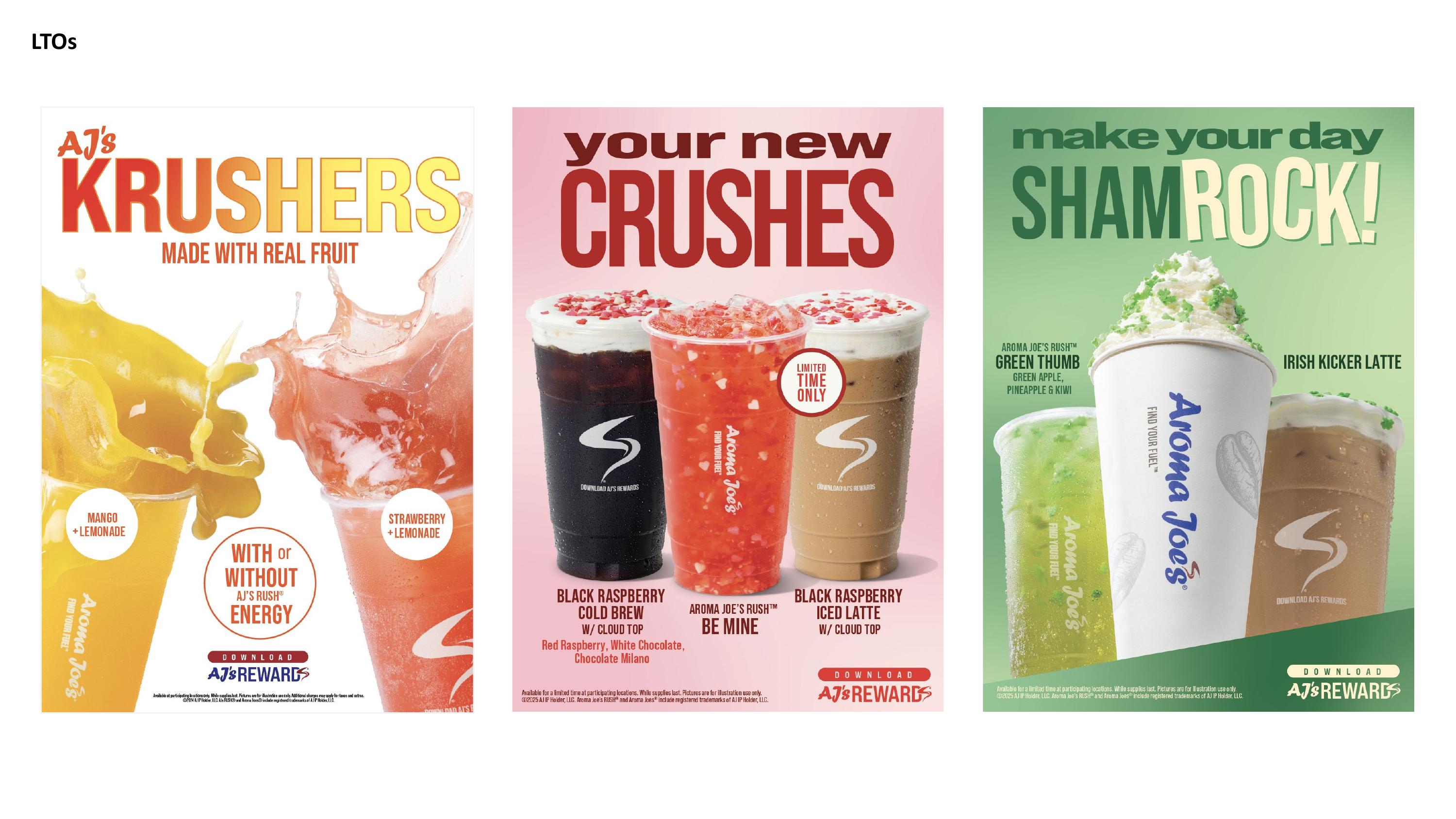 Aroma Joe's, one of the fastest-growing franchises in the country, sought to build brand recognition in highly competitive new markets. To address this, we crafted a dynamic brand evolution and vibrant campaign platform designed to engage a younger audience while remaining adaptable to different franchise locations. The strategy focused on creating a visual identity and tone that can resonate across diverse markets. With the use of vibrant brand colors, new dynamic product photography, and standardized clear, simplified messaging, we fully revamped AJ's POP advertising. This approach not only drove consumer engagement but also improved store efficiency, benefiting both customers and throughput. The result is a versatile system of seasonal and brand assets that enhances recognition and supports the franchise's expansion.